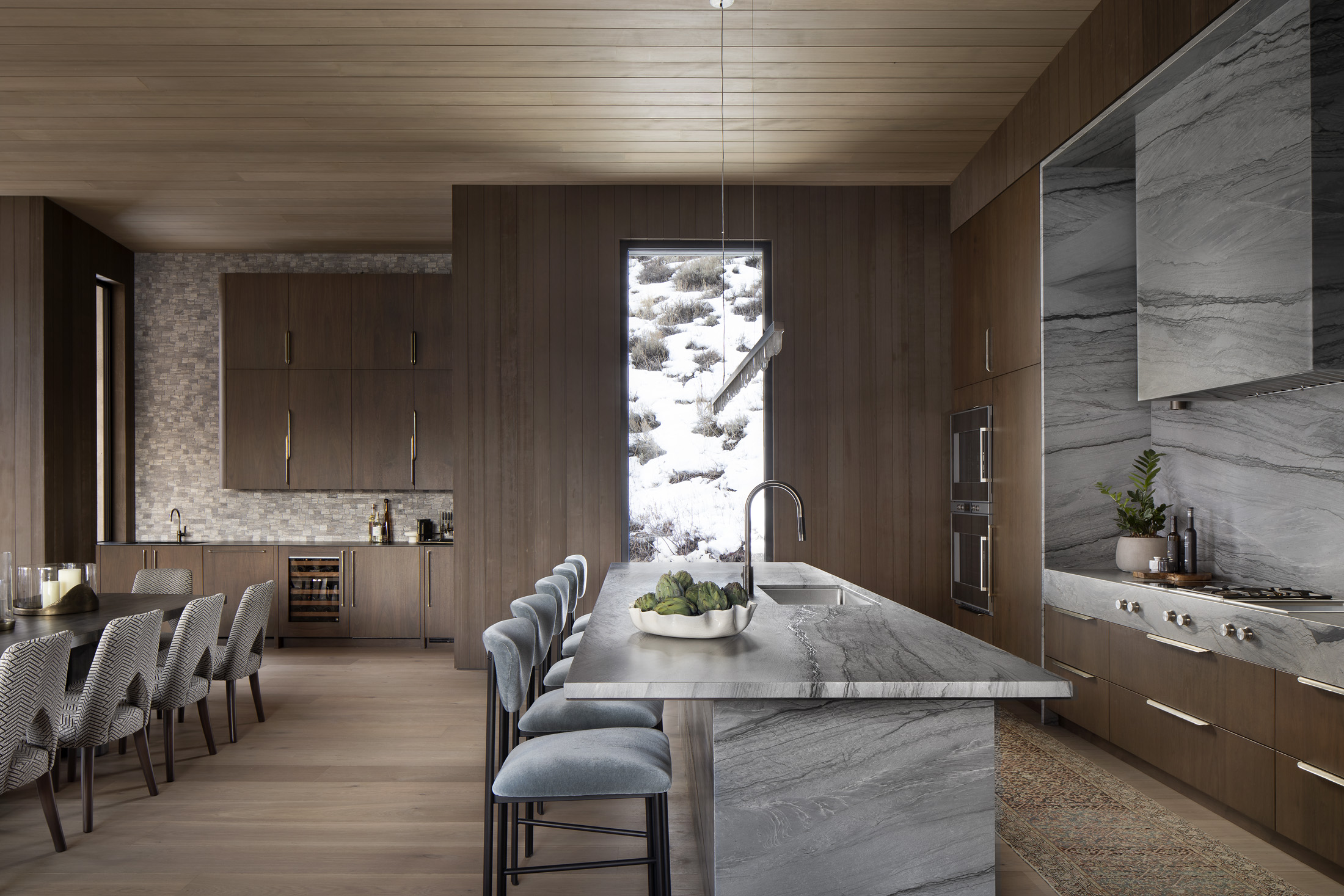 Natural materials like wood and stone anchor the home, allowing it to feel seamlessly integrated with its setting. A slender, glass-forward profile ensures the outdoors remains the focal point.