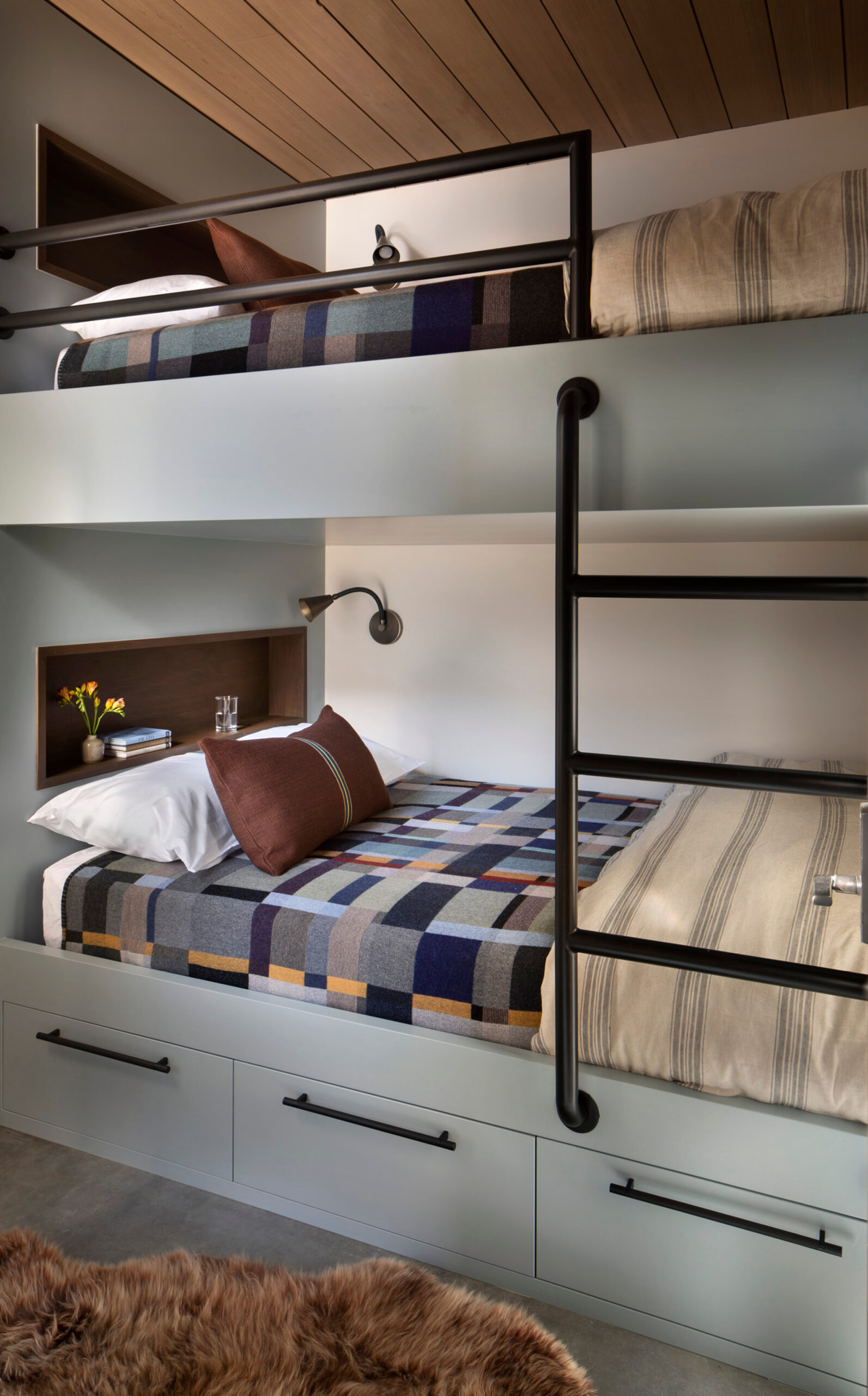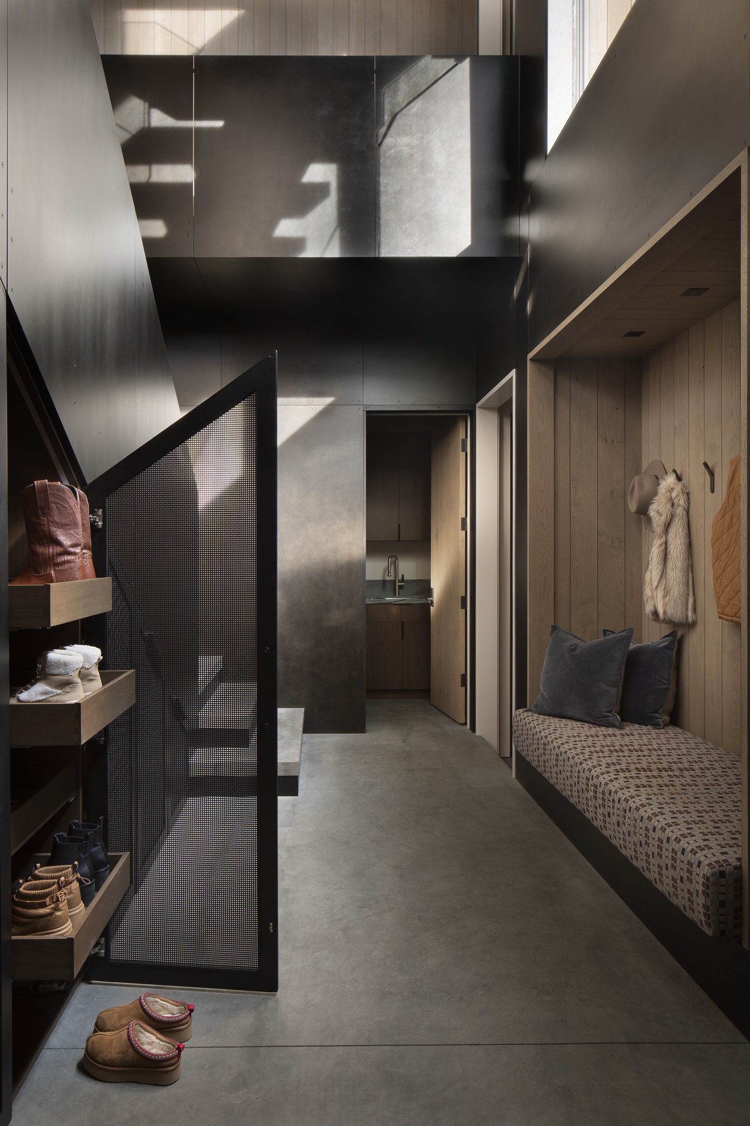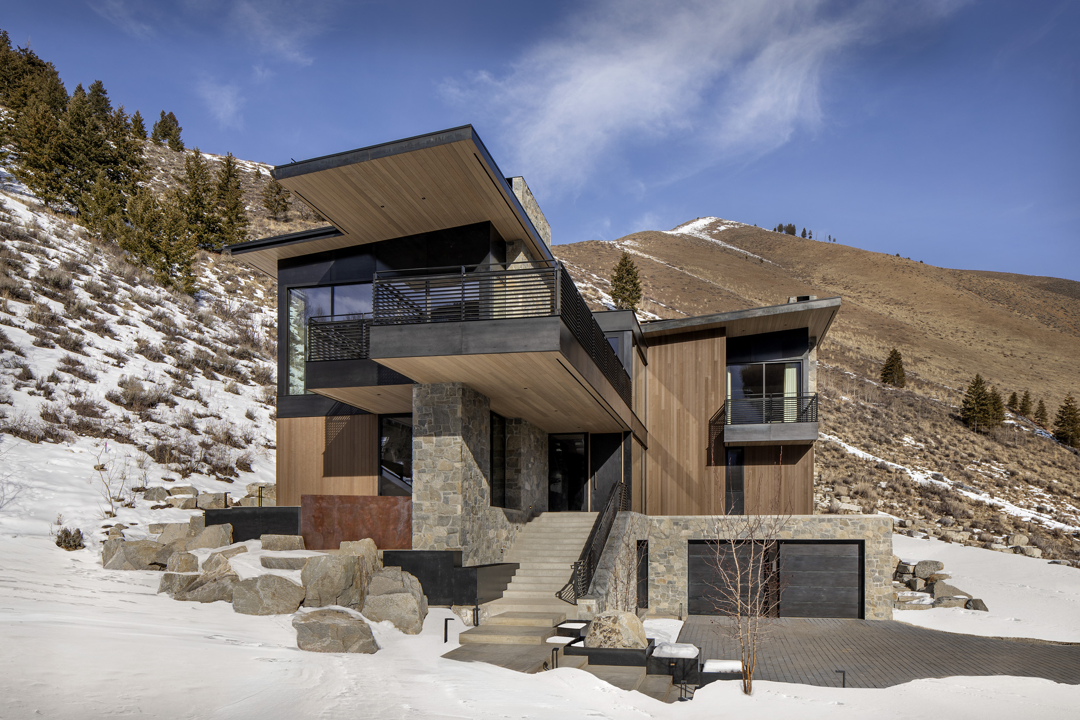 Because the home is situated in an avalanche zone, a massive anchoring wall contrasts with the seemingly floating upper levels, balancing strength with openness. Together, these elements create a home that responds thoughtfully to its dramatic landscape and environmental constraints, resulting in a form that feels both striking and deeply rooted in its setting.