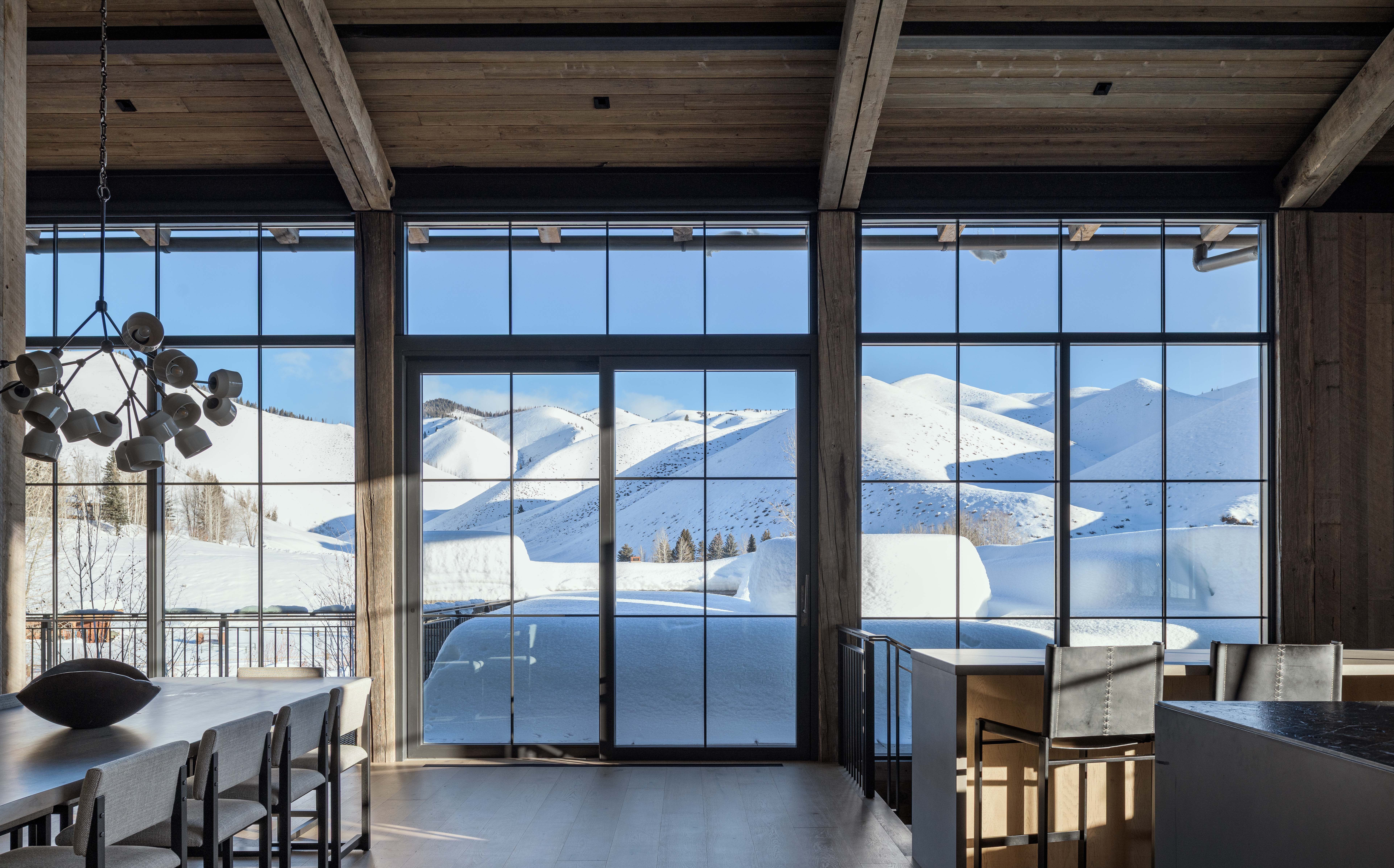 The kitchen extends to an open terrace for outdoor dining and entertaining, while a covered terrace off the living room offers shade. A grated bridge links the two terraces, expanding outdoor circulation. Designed for year-round mountain living, the home incorporates radiant floors, solar panels, and passive solar orientation.